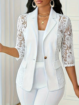 Sublimez votre style quotidien avec notre blazer, le parfait mélange d'élégance et de simplicité. La patte de boutonnage à un seul bouton et les détails en dentelle contrastée semi-transparente ajoutent une touche de sophistication, le rendant idéal pour les superpositions au printemps et en automne.